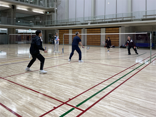 「初級者クラス」は、男性3名+女性1名+中学生1名の5名が1コートでダブルス試合をしました。